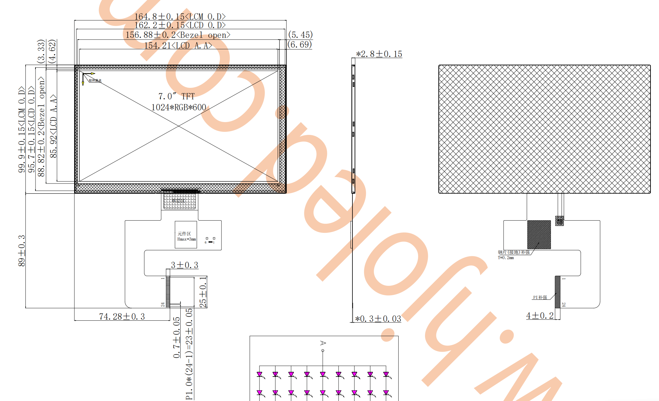 Màn hình ngang TFT 7 inch thường có độ phân giải 1024*600 và giao diện MIPI 4 kênh. Màn hình LCD 2 kênh đã hiếm, những màn hình tích hợp cáp màn hình cảm ứng điện dung với cáp màn hình LCD còn hiếm hơn, làm tăng khối lượng công việc cho các kỹ sư phần cứng. Các kỹ sư của Công ty Công nghệ Hongjia Thâm Quyến đã sản xuất hàng loạt thành công màn hình ngang IPS 7 inch với độ phân giải 1024*600, giao diện MIPI 2 kênh và màn hình cảm ứng điện dung. Đầu nối 24-PIN tích hợp màn hình cảm ứng và tín hiệu hiển thị, với một giao diện cáp duy nhất giúp khách hàng thiết kế dễ dàng hơn.