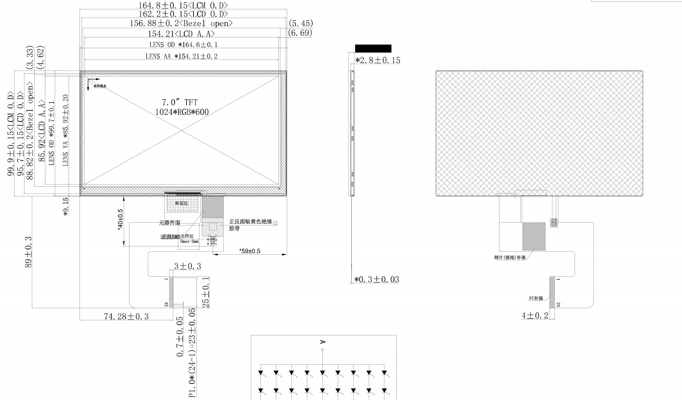 7 inch, 1024×600 (tỷ lệ khung hình khoảng 15:9, gần 16:9). Đây là thông số kỹ thuật hiển thị từ cấp cơ bản đến tầm trung điển hình, tiết kiệm chi phí và có khả năng đáp ứng hầu hết các nhu cầu hiển thị giao diện đồ họa cơ bản, nhưng mật độ điểm ảnh của nó (khoảng 169 PPI) không cao bằng màn hình có độ phân giải cao hơn. IPS (In-Plane Switching) mang lại những ưu điểm như góc nhìn rộng, tái tạo màu sắc tốt và tính nhất quán cao. Bất kể góc nhìn, độ suy giảm màu sắc và độ sáng đều ở mức tối thiểu, lý tưởng cho các ứng dụng yêu cầu nhiều người xem hoặc thao tác từ các góc khác nhau (như điều khiển công nghiệp, hệ thống điều khiển nhà thông minh và thiết bị di động).